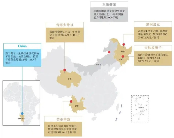 截至2025年6月底,山金国际拥有三个位于中国的在产金矿(黑河洛克、吉林板庙子、青海大柴旦),一个位于中国的待复产金矿(华盛金矿)、一个位于纳米比亚的在建金矿(双子山),以及一个于中国营运的银铅锌多金属矿(玉龙矿业)。